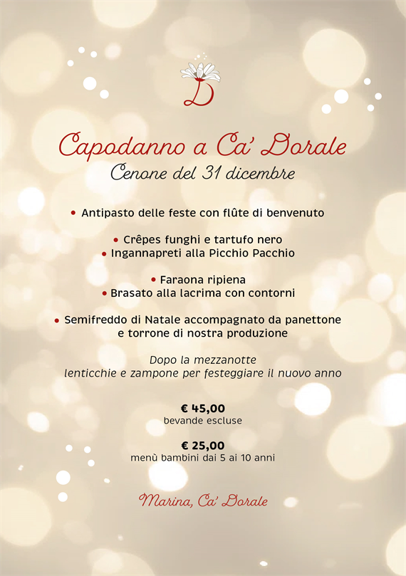 Il Cenone prevede un ricco menù che si apre con l’antipasto delle feste, due primi piatti, due secondi di carne con contorni e per finire un bel semifreddo accompagnato dal panettone e dal torrone di Ca’ Dorale.