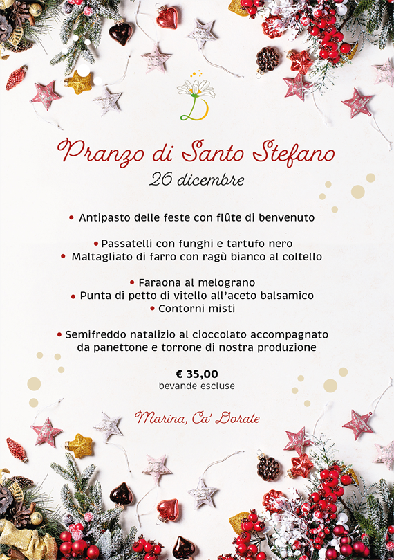 Il pranzo del 26 dicembre offre un menù ricco e festoso, con un variegato antipasto sfizioso, due primi piatti, due secondi con contorni misti ed un bel dolce natalizio per chiudere in bellezza.